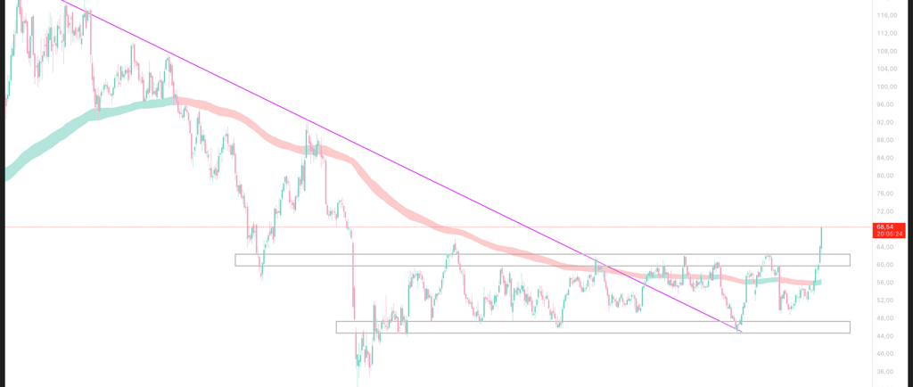 nous avions identifie une consolidation sur l'action AB INBEV. l'action est en train de casser notre zone psychologique Weekly et notre EMA
