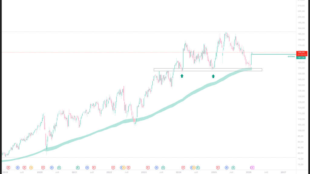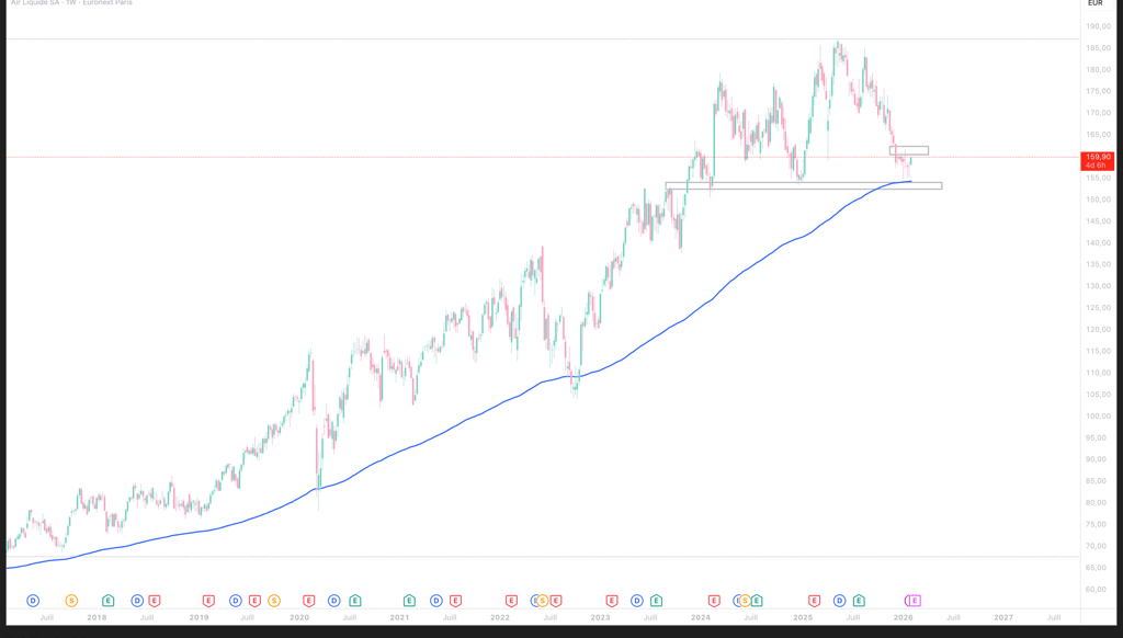 nous avions identifie un support majeur sur l'actionn air liquide. l'action est en train de rebondir sur notre ema et notre zone psychologiqueweekly.